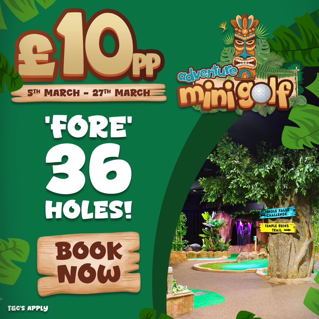 Our popular discounted Mini Golf tickets return this month - online or walk-in! It's £10pp for 36 holes, no matter what age you are… That's just 28p for every hole! (Ts & Cs apply, see below)